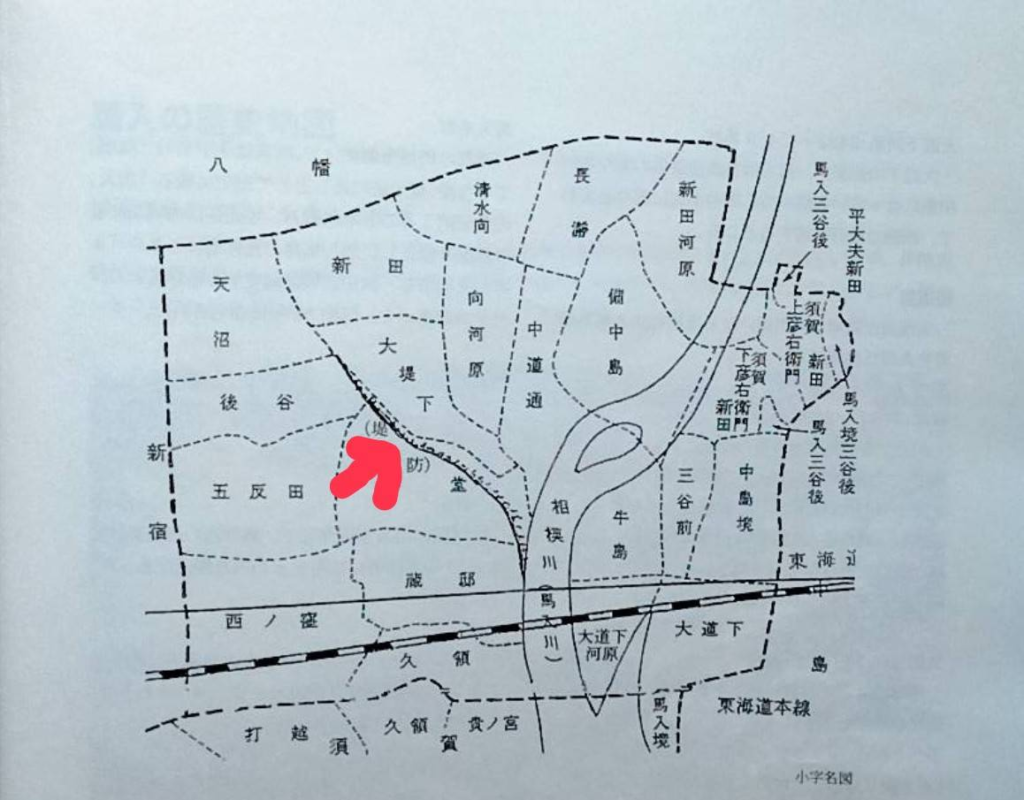 平塚側でも、現在の本流の西側にしっかりした堤防が作られていました。下の馬入村小字の地図には堤防跡が記されています。