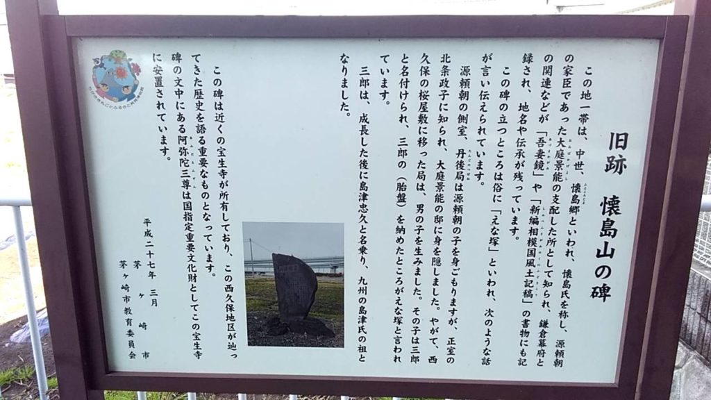 茅ヶ崎西久保、新湘南国道のインターの近くに、懐島山の碑、通称えな塚と呼ばれるものがあります(添付)。碑文によると、丹後内侍は頼朝の子を身ごもったが、政子に知られ、大庭景能の屋敷に身を隠し、男子を生んだ。その子は成人して島津忠久と名乗り、九州島津氏の祖となった、とするものです。その時のえな(胎盤)を納めたところがえな塚といわれるようになったと。