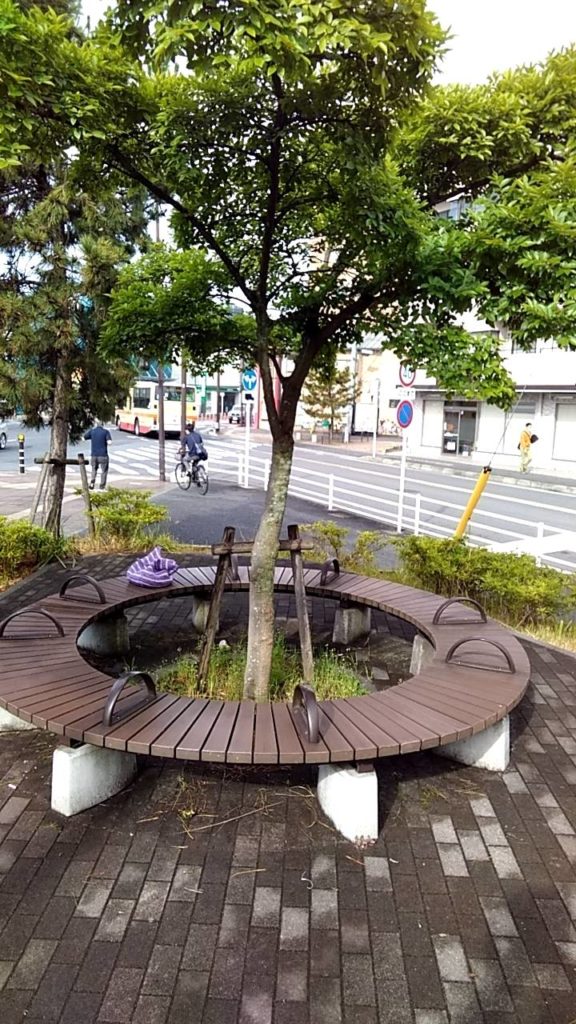 除去されている例を挙げると馬入の一里塚がそれで、塚というものは現在は無く、近くに説明板が立てられているだけとなっています。そういう意味で、茅ヶ崎の一里塚は貴重な史跡ですが、残念なことに元々は東海道の南側と北側に二つあったのが、北側のものは、平成22年の歩道整備の工事の際に盛り上がっていた塚は削られて、道路と同じ高さの平坦地にされてしまっているのです。そして休憩できる円形の椅子が樹木を囲って設置されています。