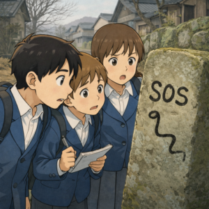 三人は古い道標の裏に不気味な “落書き” を発見する。